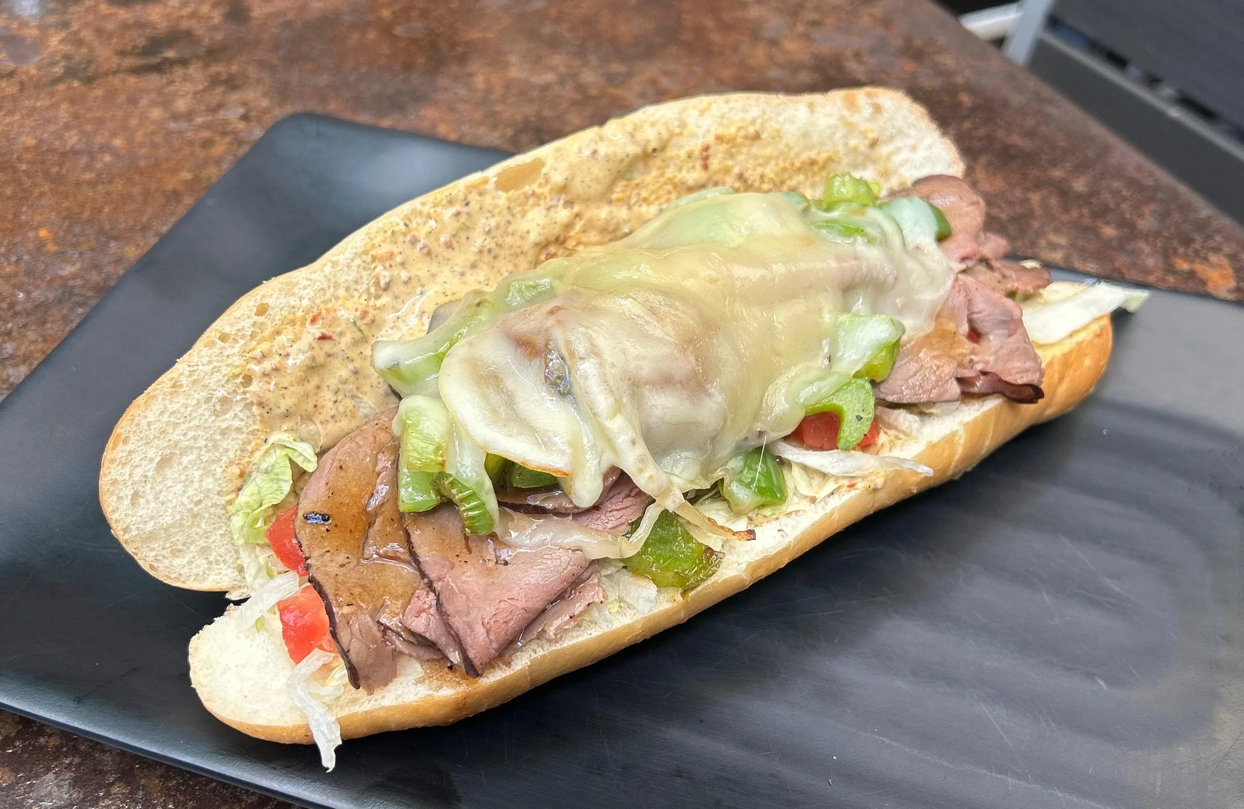 Roast beef piled high with celery, onion, green bell peppers, cajun gravy, and provolone cheese warmed just enough to melt on our hoagie roll with spicy mustard remoulade, shredded lettuce, and diced tomatoes. Served with your choice of side.
