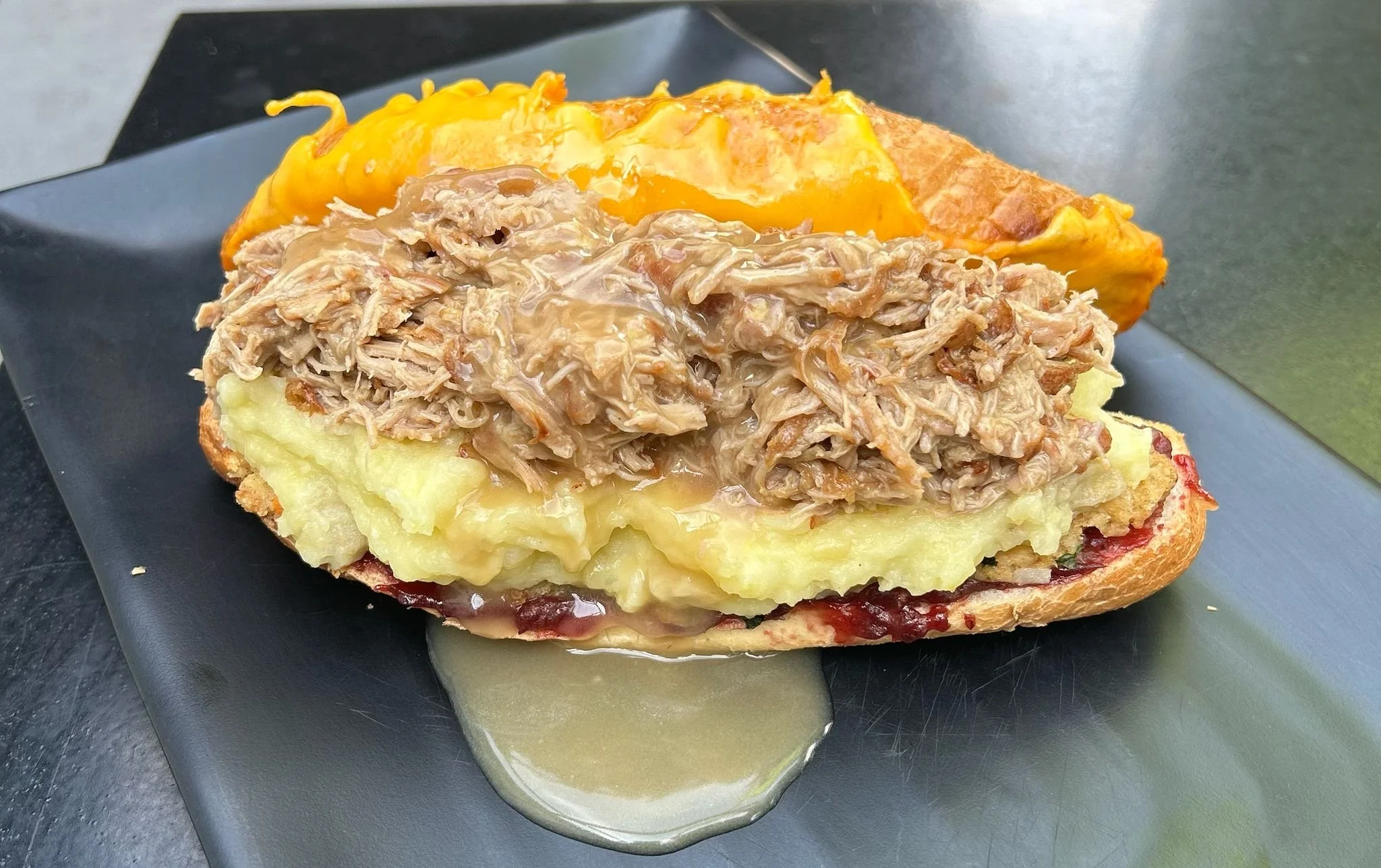 Back by popular demand! Roasted shredded turkey tossed in gravy on a toasted hoagie with melted cheddar, bourbon cranberry sauce, stuffing, and mashed potatoes. Served with your choice of side.