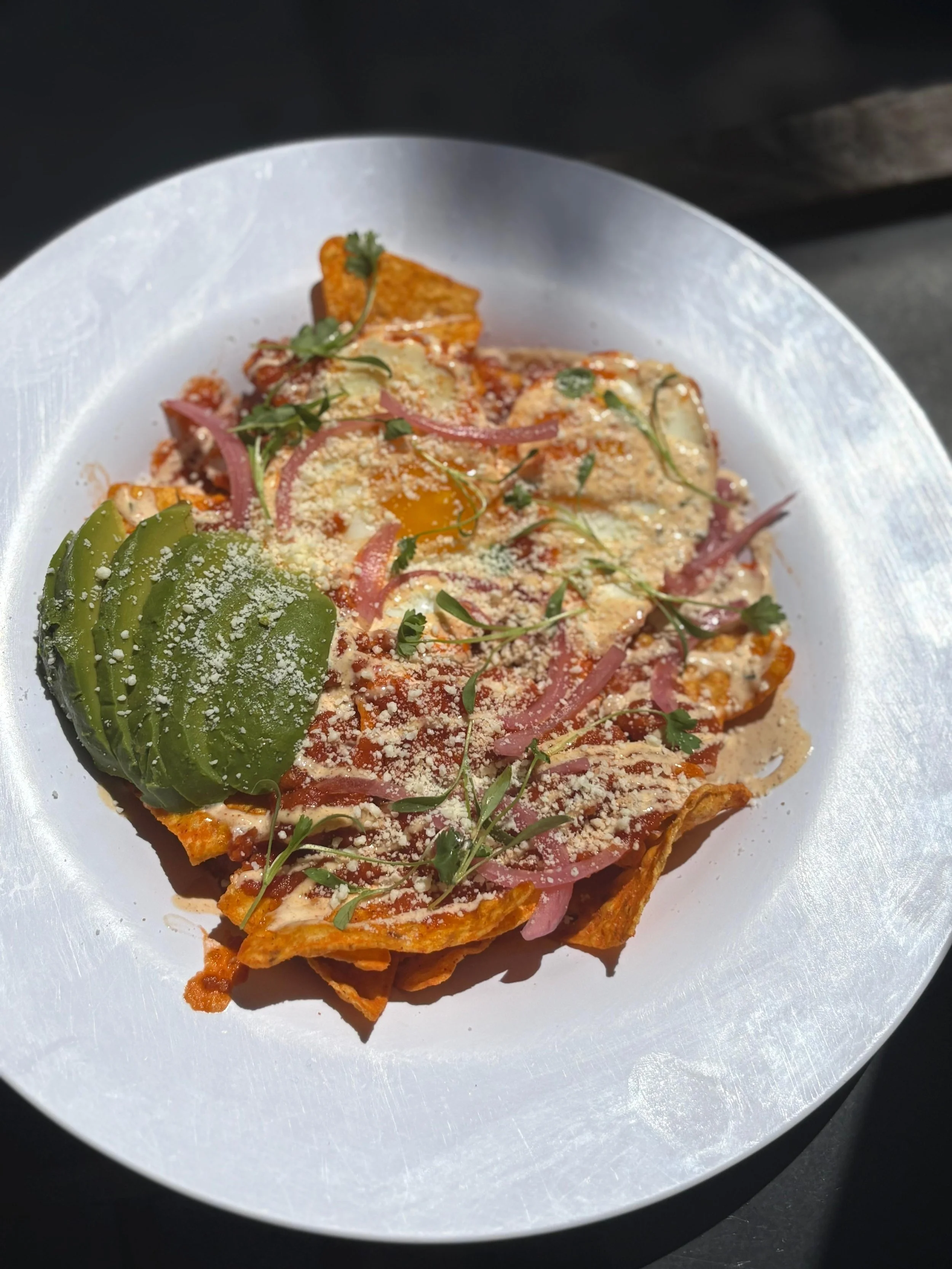 nacho doritos topped with tomato chile salsa, 2 sunny side up eggs, cojita cheese, sliced avocado, sour cream, pickled onions, and micro cilantro.