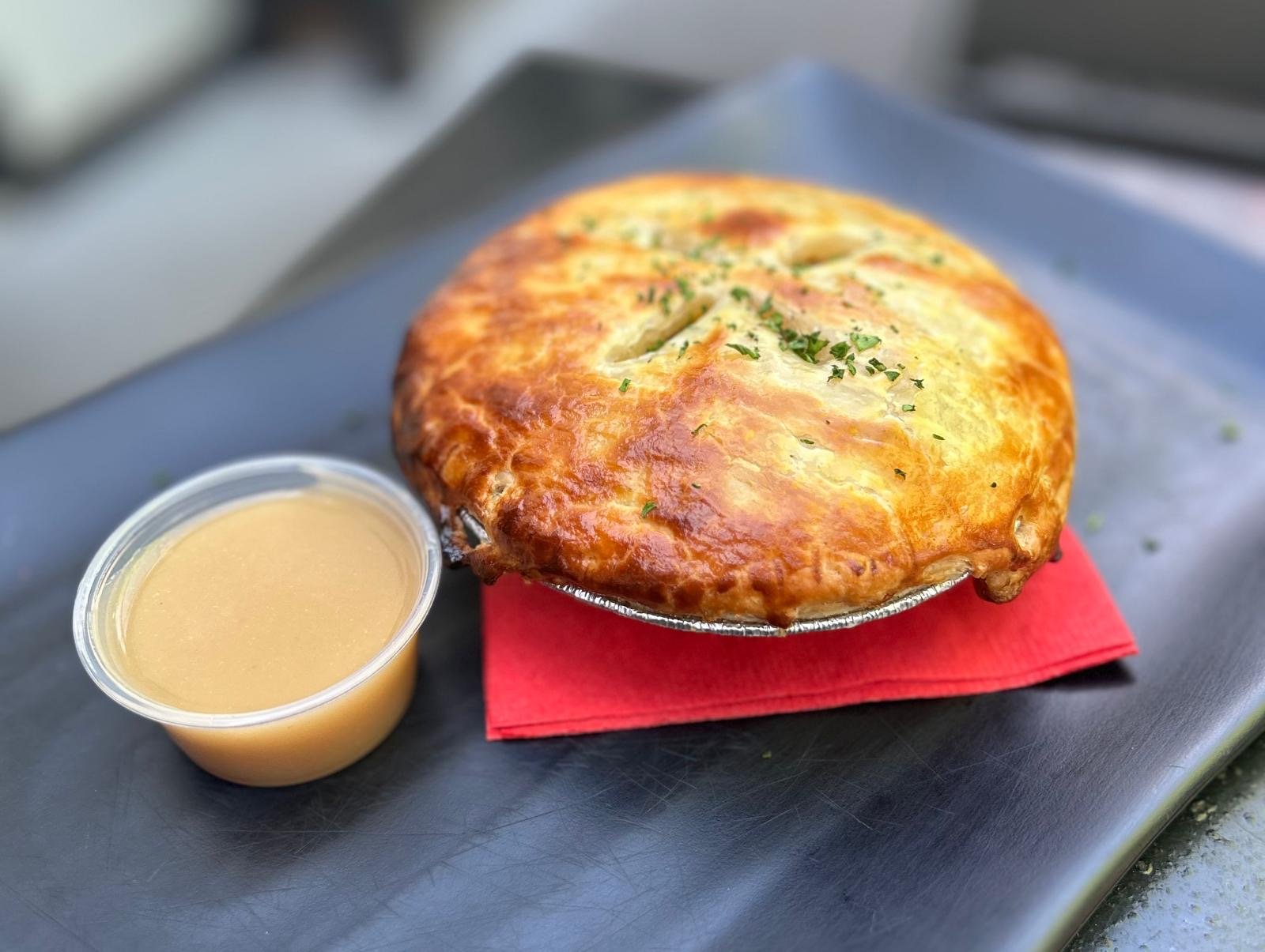 Fluffy smashed potatoes, tender shredded turkey, carrots, peas, and corn folded into rich, savory gravy. All tucked into an individual pie shell and baked until golden brown. Served with a side of extra turkey gravy.