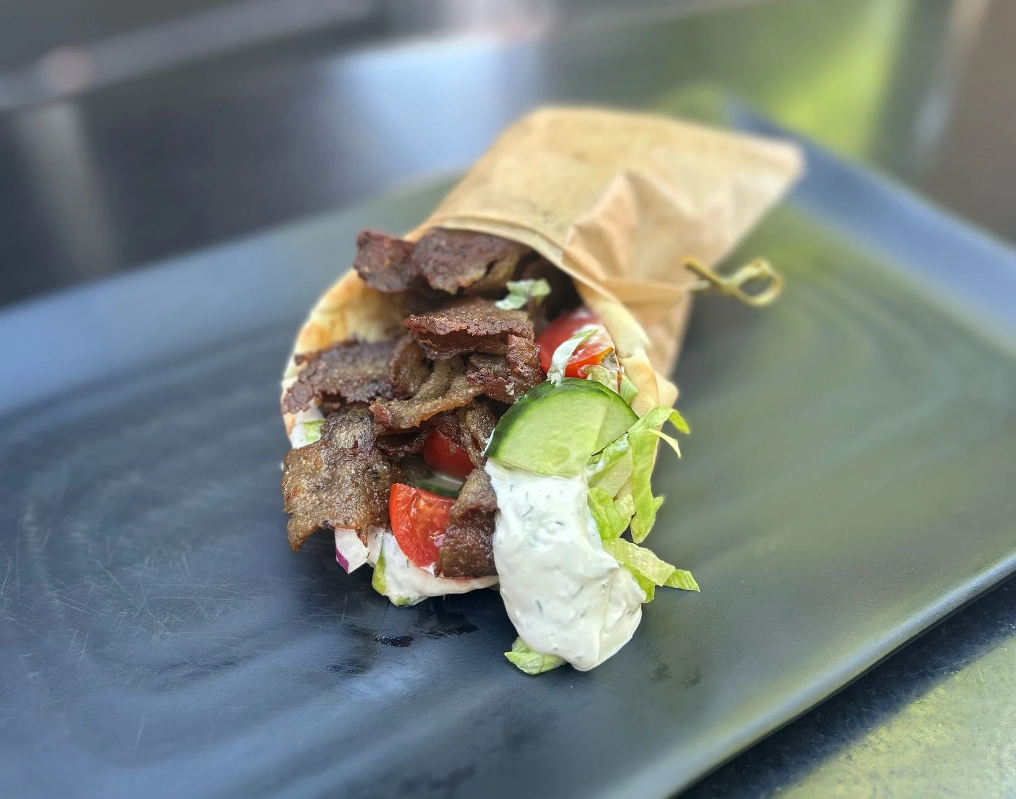 Seared Lamb meat piled high on Pita with house made Tzatziki, thinly sliced cucumber, red onion, and cherry tomatoes. Served with your choice of side.