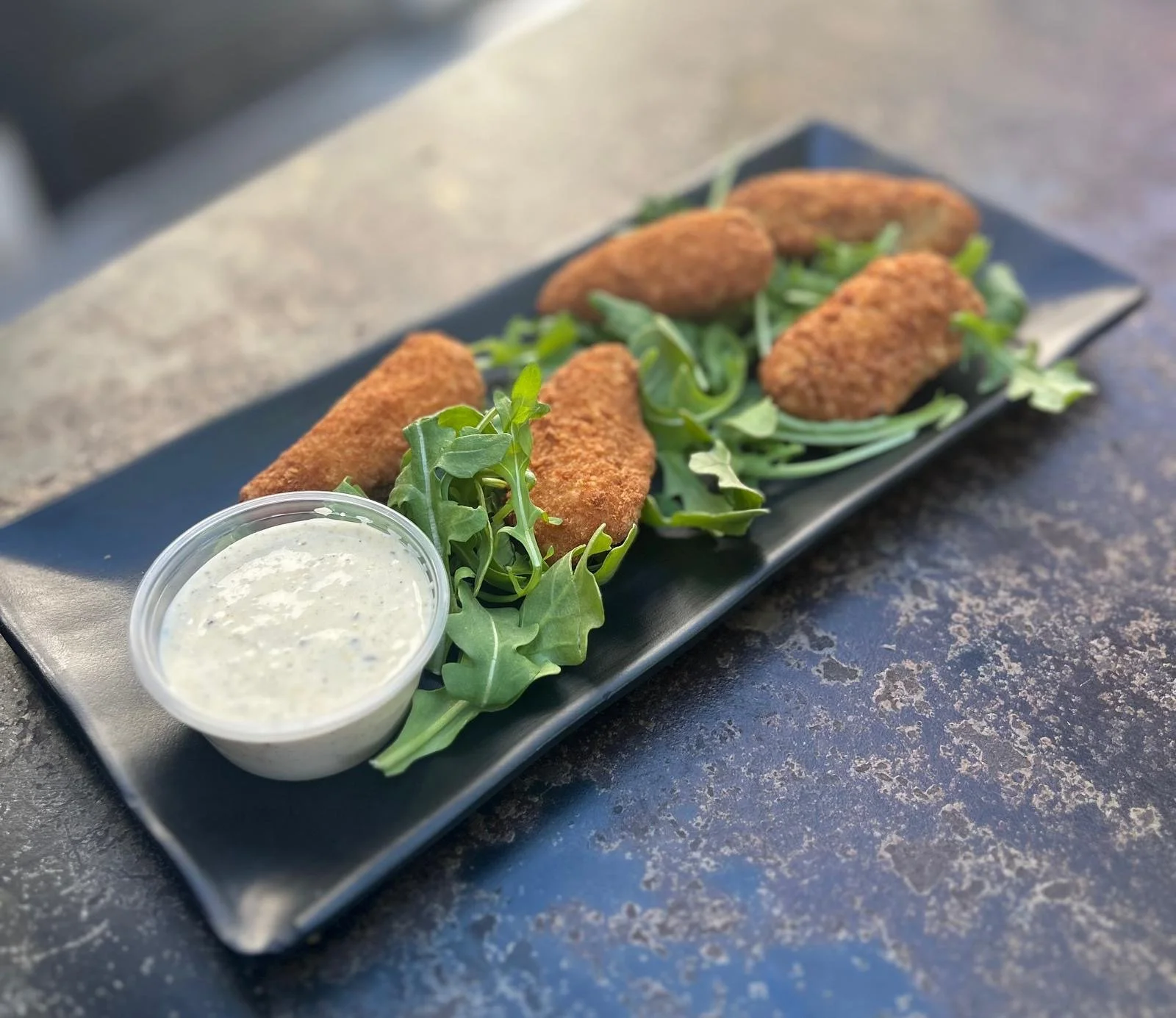 Jalapeños stuffed with cream cheese and fried golden brown served over greens with a side of our sweet corn “elote” Ranch.