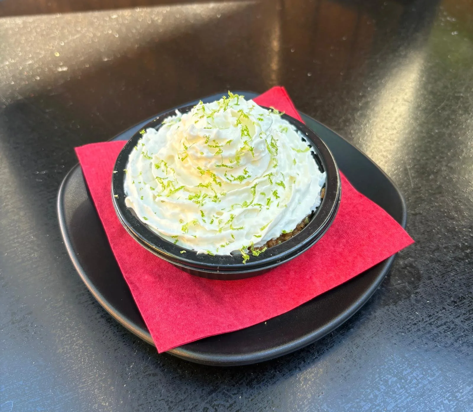 An individual Kenny’s Key Lime Pie topped with whipped cream and fresh lime zest.