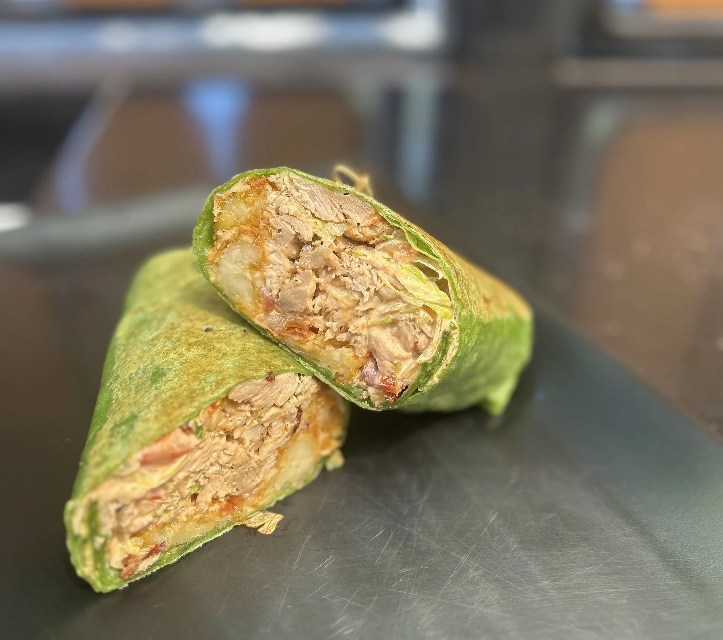 Shredded chicken, crispy tots, bacon, shredded muenster, lettuce, tomatoes, red onion, and Russian dressing all rolled up tight and fat in a spinach tortilla.