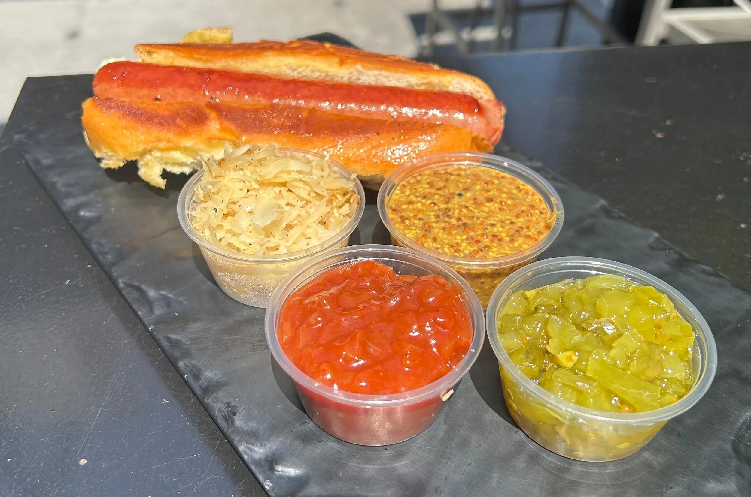 All beef hotdog on a fresh brioche bun with your choice of: sauerkraut, bright green relish, Guinness mustard, or tangy onion sauce. Served with a side of your choice.