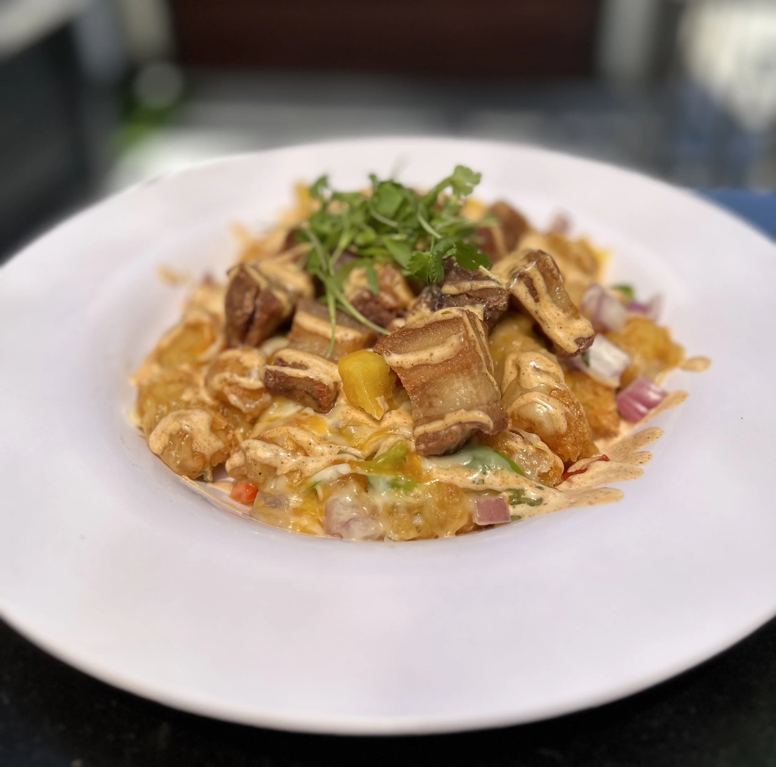 Crispy pork belly, golden tater tots, tri-colored bell peppers, and red onions tossed with queso and our 3-cheese blend. Garnished with Santa Fe sauce and micro cilantro.