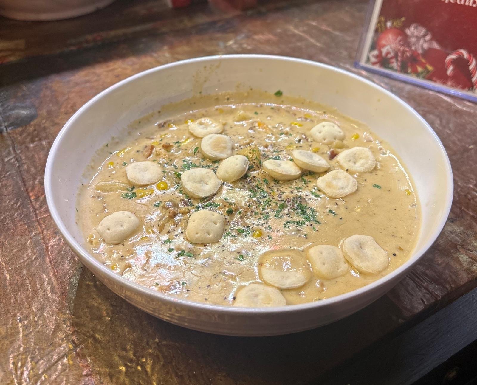 loaded with three types of clams, chopped bacon, diced potatoes, onion, and tons of corn. Finished with fresh parsley and cracked pepper, and served with a side of oyster crackers.