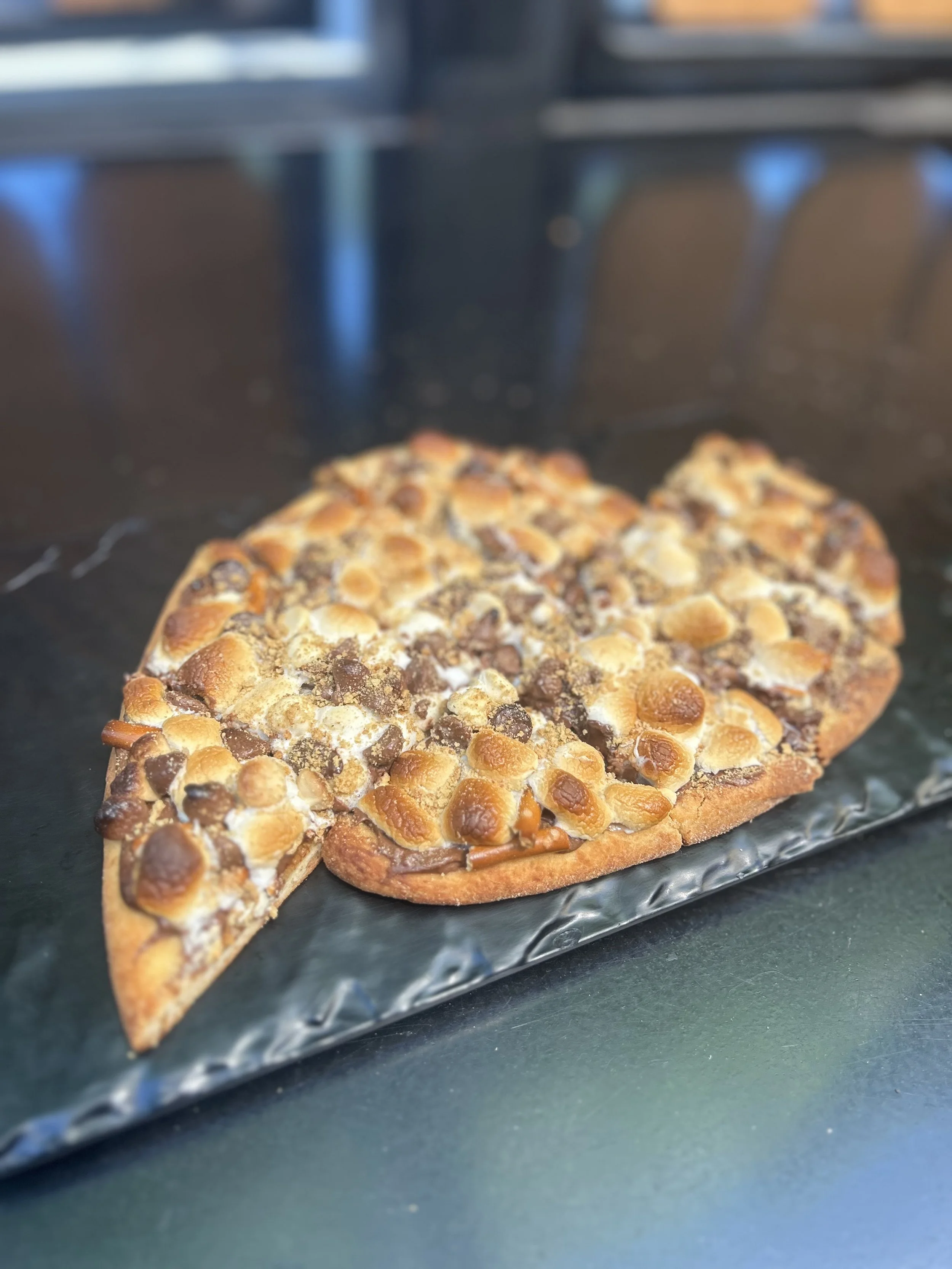 Nutella base with chunks of dark, white, and milk chocolate, marshmallow, and chunks of pretzel. Garnished with graham cracker kief.