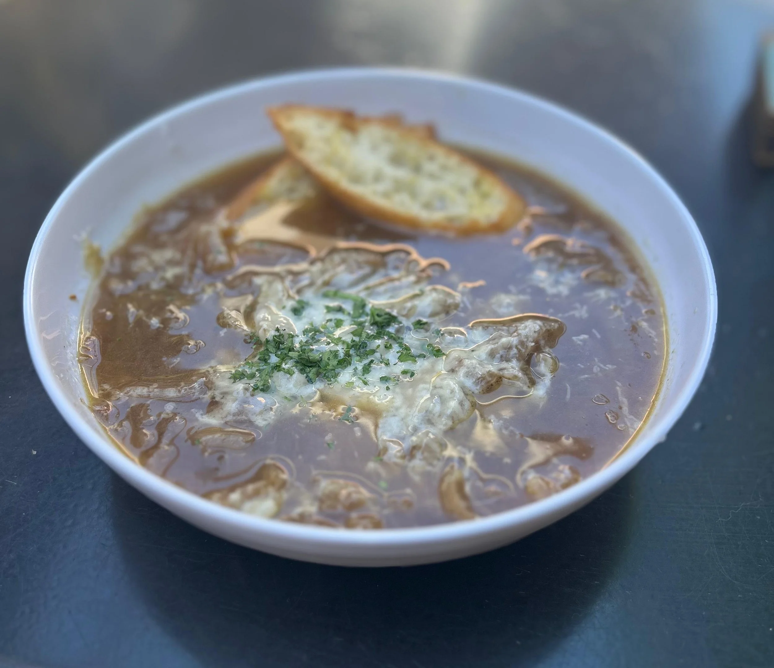 4 different types of onions caramelized in a rich vegetable broth and finished with toasted crostini and finely shaved Gruyère cheese.